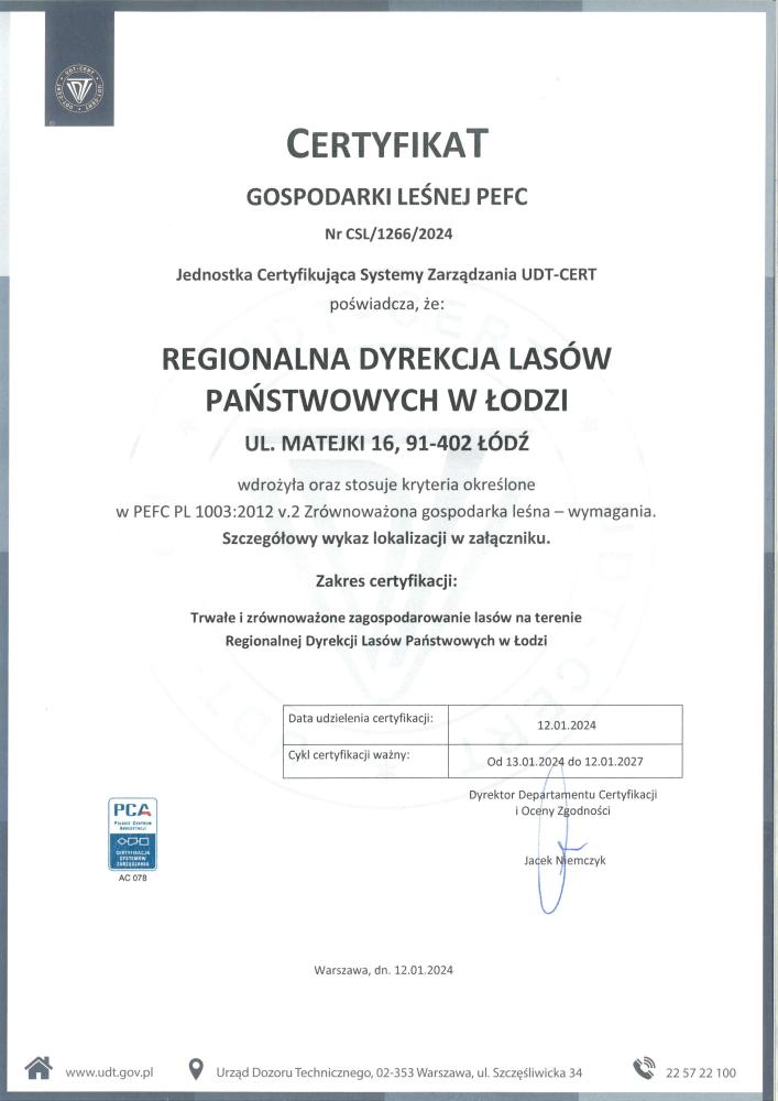 W grudniu 2023 roku oraz styczniu 2024 roku na terenie Regionalnej Dyrekcji Lasów Państwowych w Łodzi został przeprowadzony audyt gospodarki leśnej w systemie PEFC przez zespół audytorów z Urzędu Dozoru Technicznego.